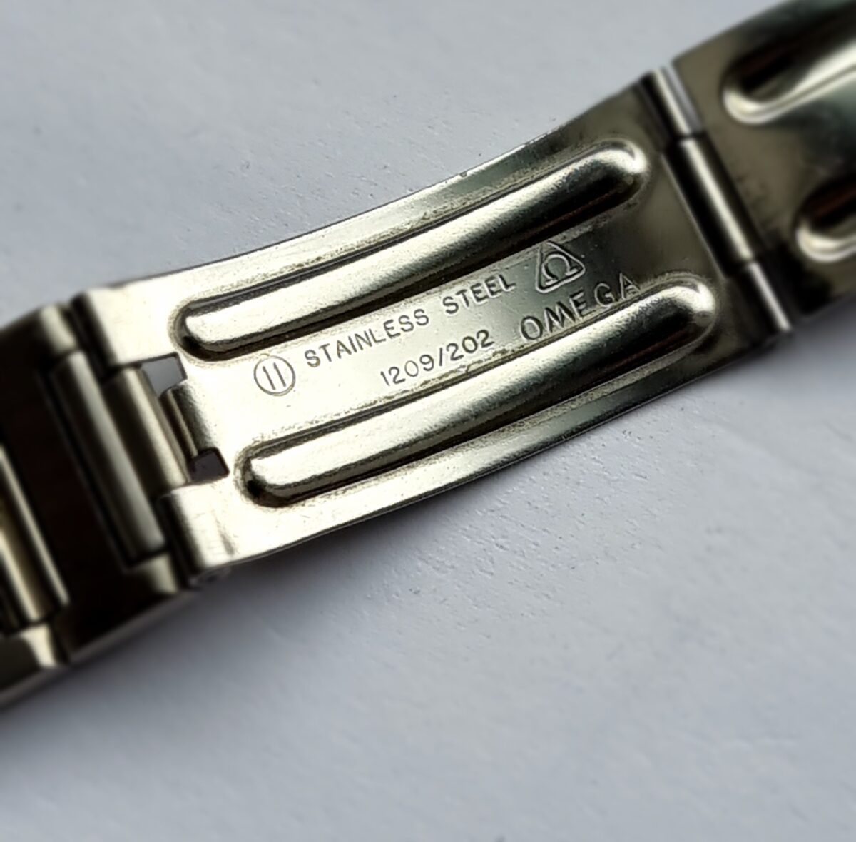 The watch is in overall very good original condition and is obviously in full working order. The original 1209/202 bracelet and ends are present, the clasp is stamped 11 . The case is in superb condition, and its original chamfers are still clearly there. These are big watches and subsequently get knocks and dings, but this one is very good. The case appears unpolished and the original Omega brush/polished finish is still present .