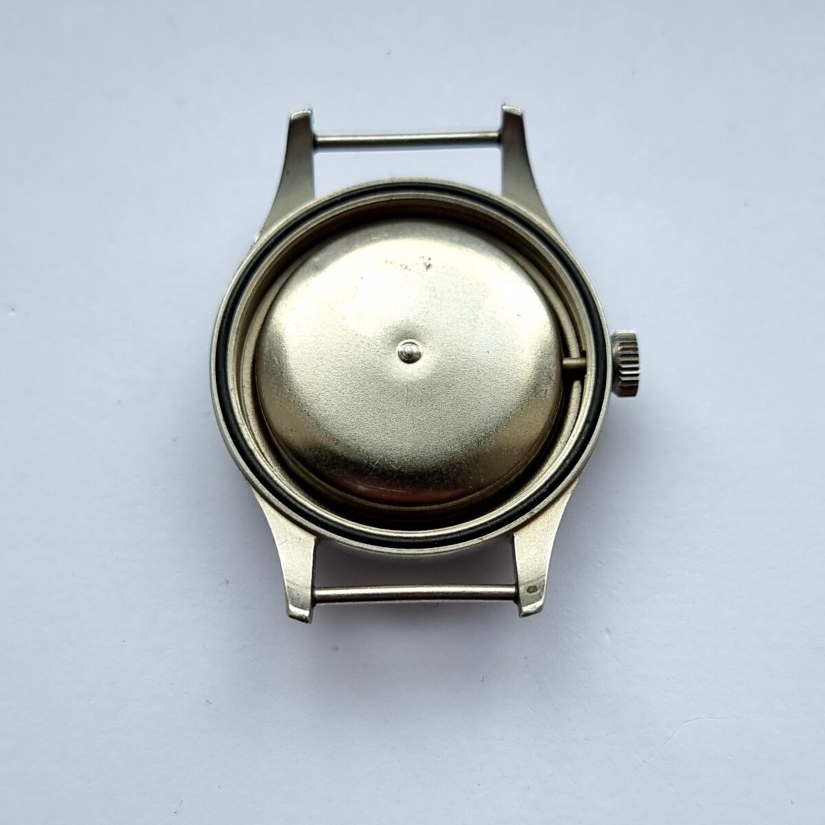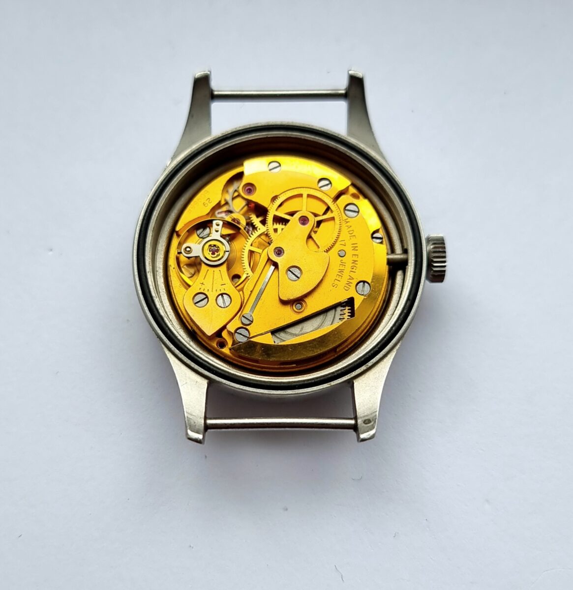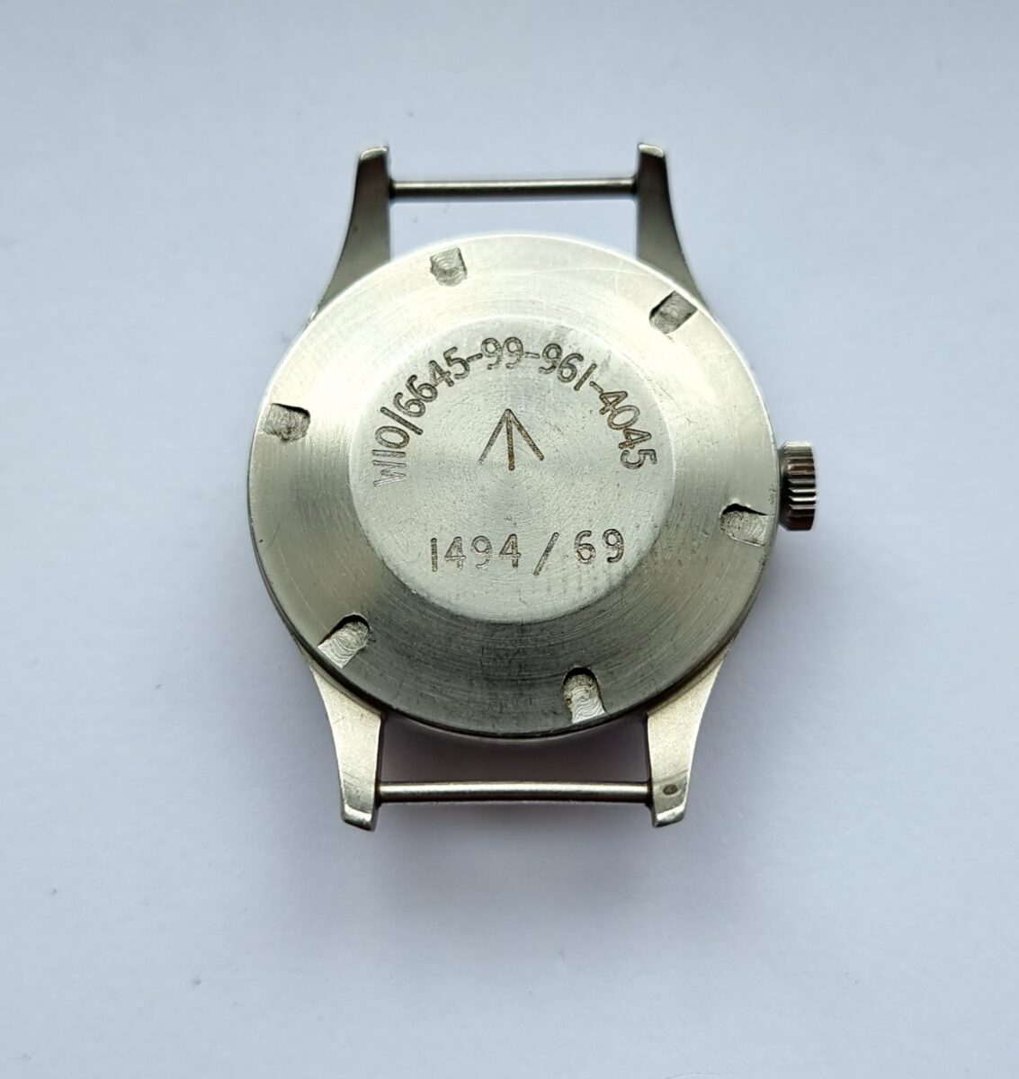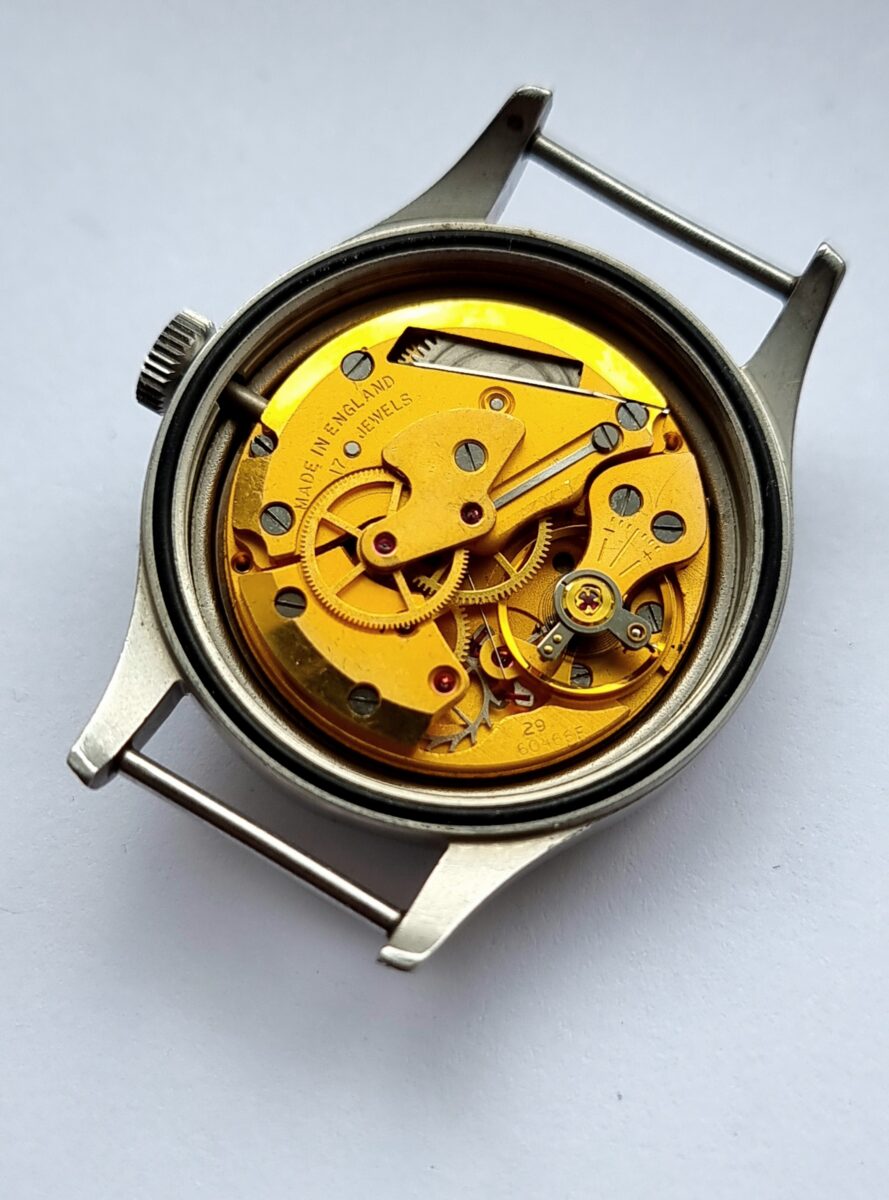 This W10 is in nice condition with a lovely patina aged dial and handset. Smiths issued these to the Ministry of Defence between 1967 and 1970. This piece was designated for used by the British Army, and is stamped W10. The case back is still extremely sharp with clear and legible engravings.